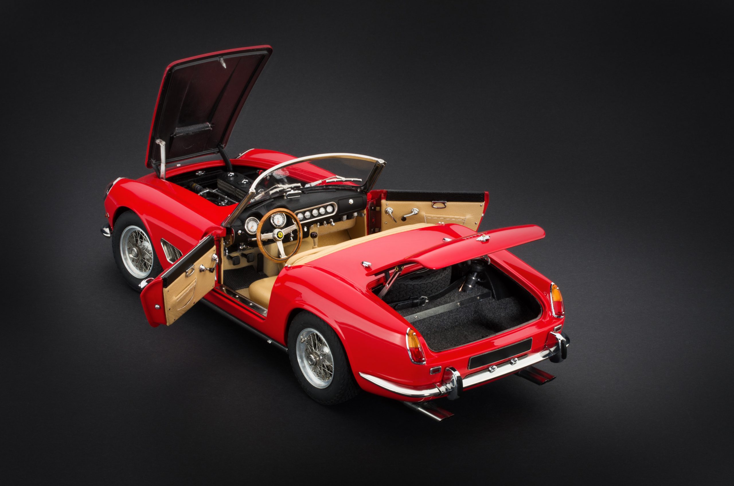 Sur un total de 105 voitures construites entre 1958 et 1963, réparties en environ 50 LWB et 55 SWB, divers représentants ont pu être admirés sur l'écran de cinéma. Pour son modèle réduit, CMC a opté pour la version routière du SWB-California Spyder avec des phares masqués et des cornes de pare-chocs supplémentaires. La particularité de ces modèles limités est qu'ils sont livrés avec un toit rigide d'usine, autrefois très rarement proposé par Ferrari, en bleu, argent et noir.